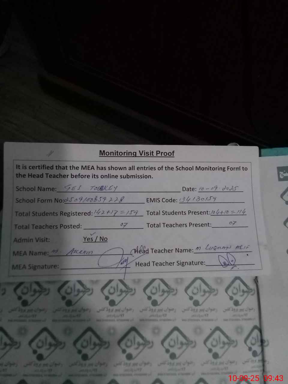 | Monitoring Date: 10-09-2025 | Start Time: 10-09-2025 08:59 AM | End Time: 10-09-2025 09:45 AM | Name of MEA: K-**** Ak**** | |