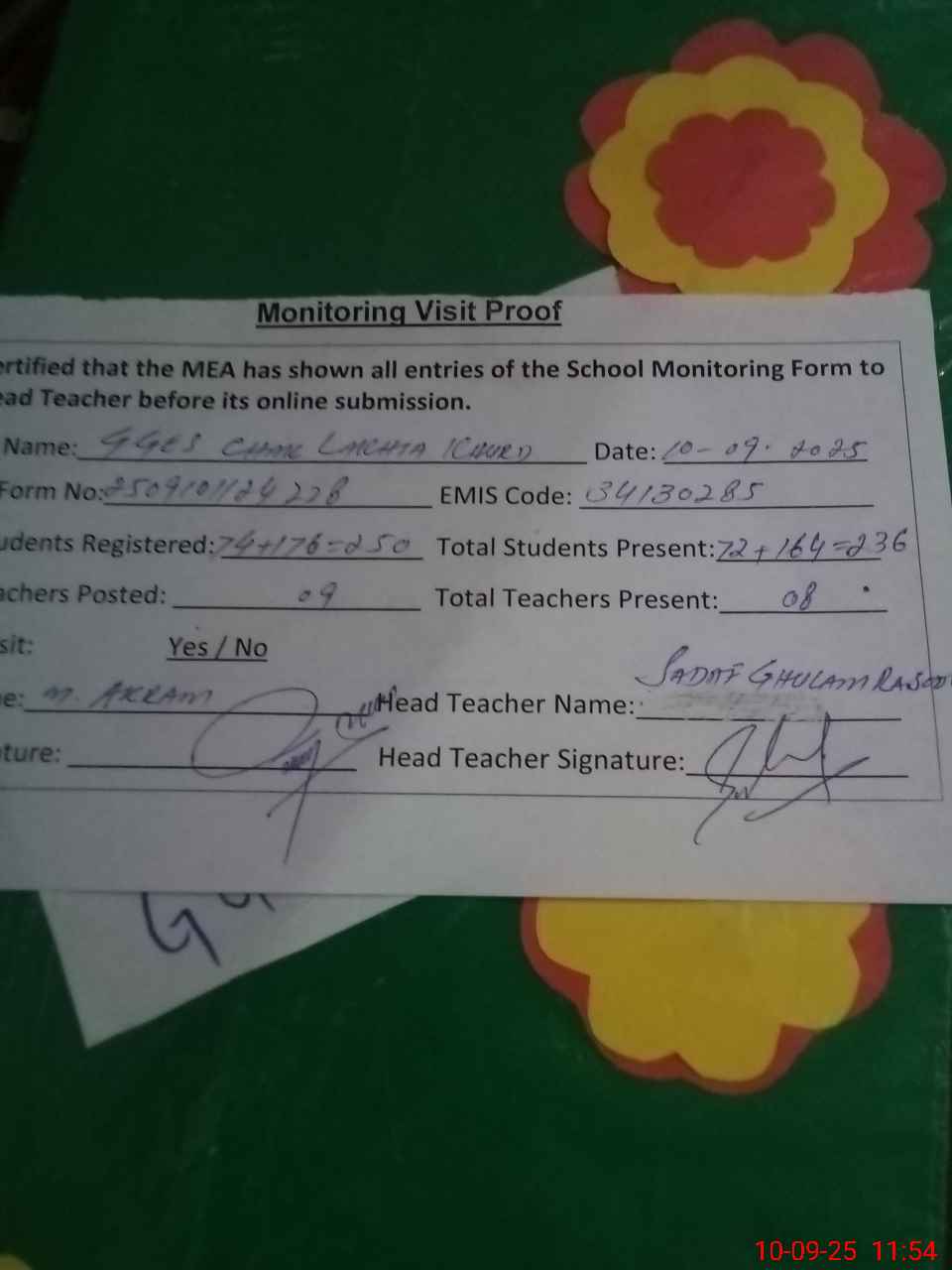 | Attendance Register | Head Teacher | MEA with School | Visit Proof |