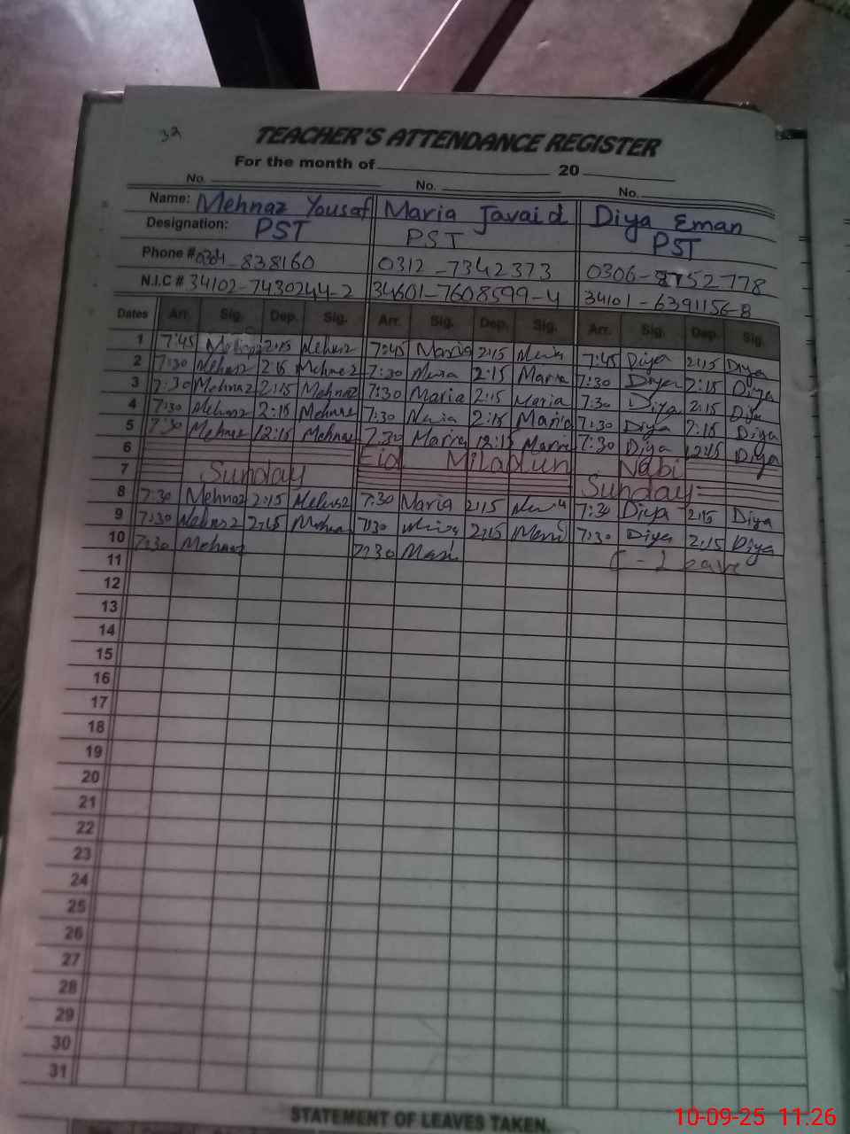 | CNIC | Full Name | Designation | R/C | Absence During Last Calender Month |