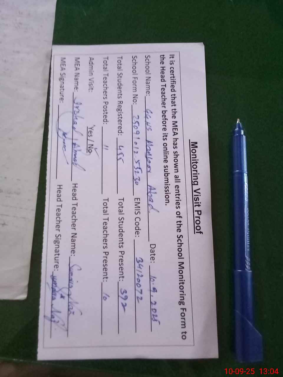 | Attendance Register | Head Teacher | MEA with School | Visit Proof |