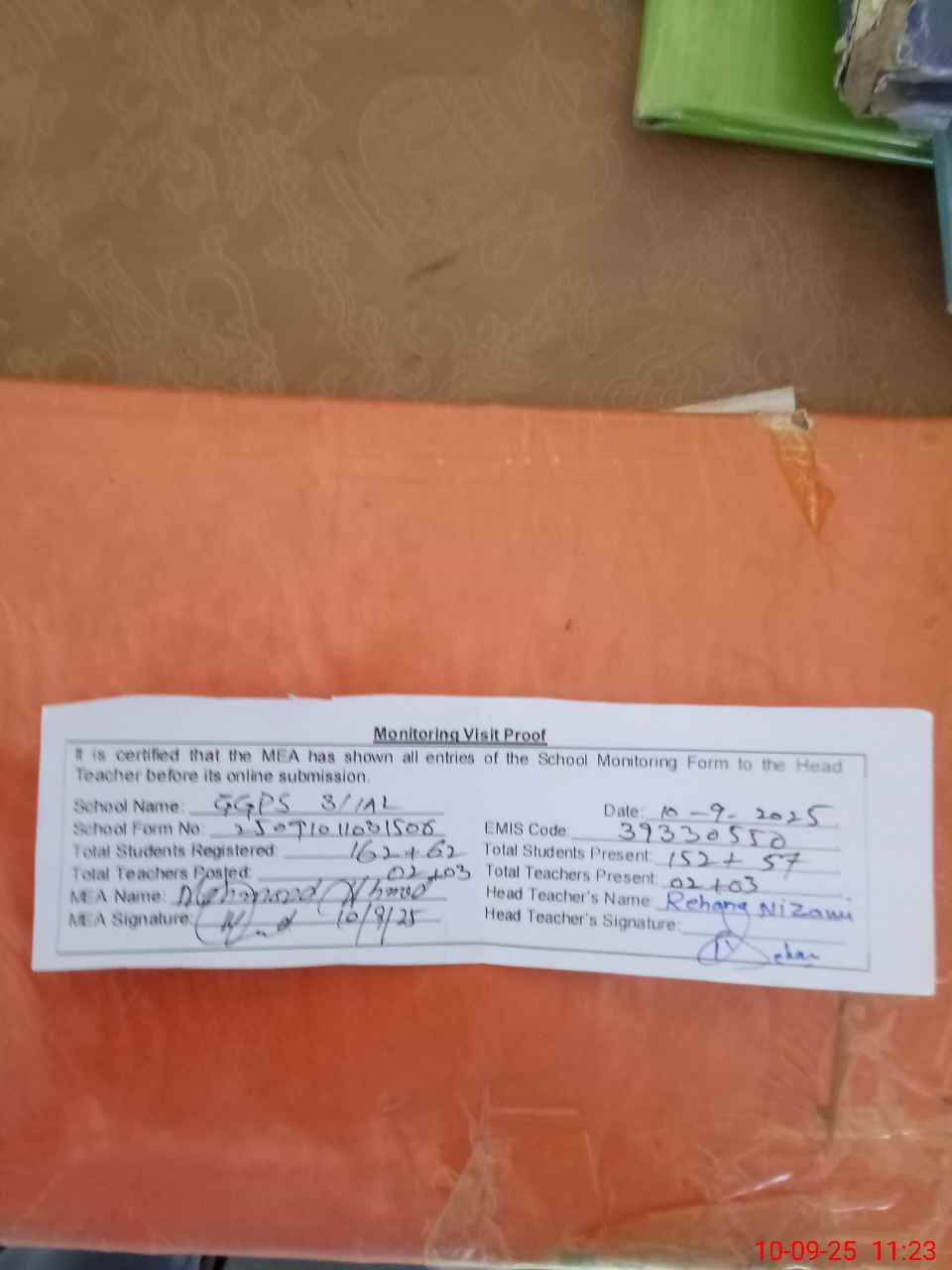 | Attendance Register | Head Teacher | MEA with School | Visit Proof |