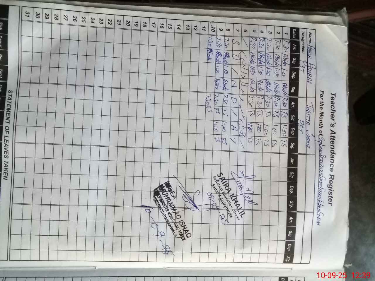 | Name: AB**** AS**** Designation: (School Headmaster's/Headmistress's) PST Phone/Cell Number: 03**** |
