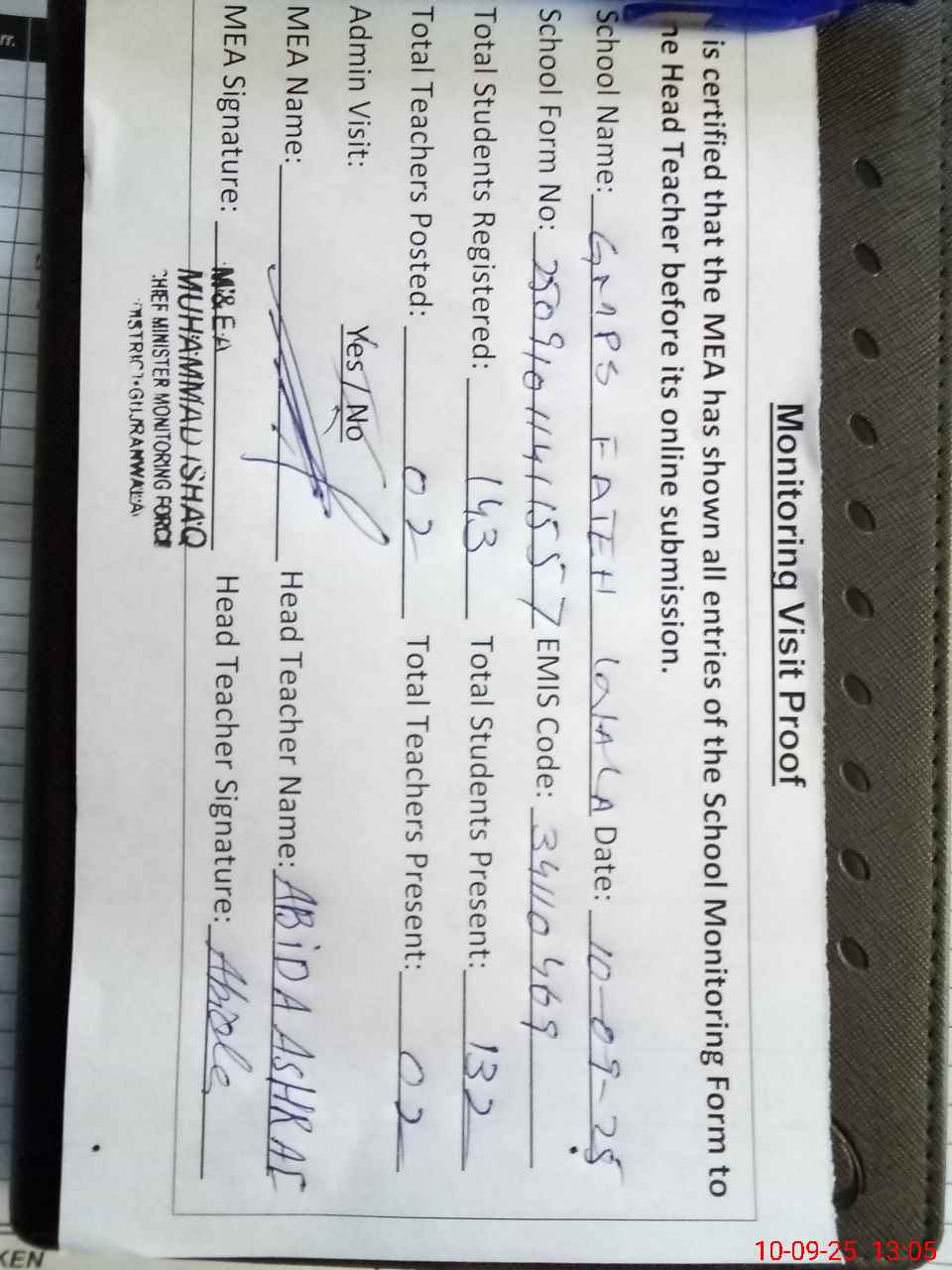 | Attendance Register | Head Teacher | MEA with School | Visit Proof |