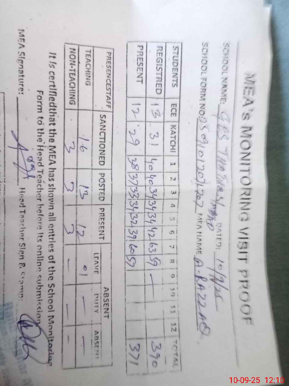 | Attendance Register | Head Teacher | MEA with School | Visit Proof |