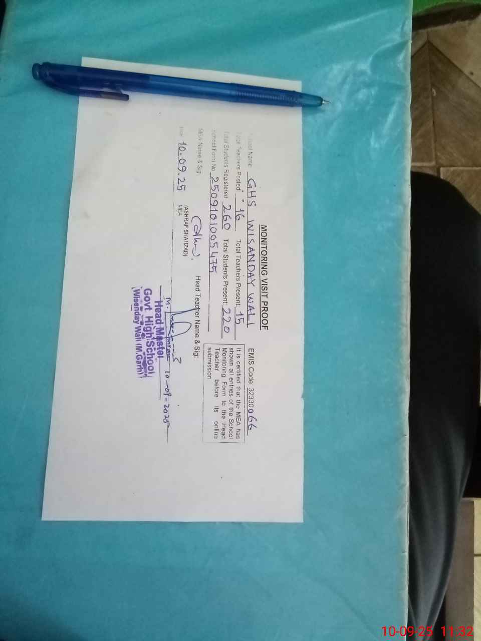 | Attendance Register | Head Teacher | MEA with School | Visit Proof |