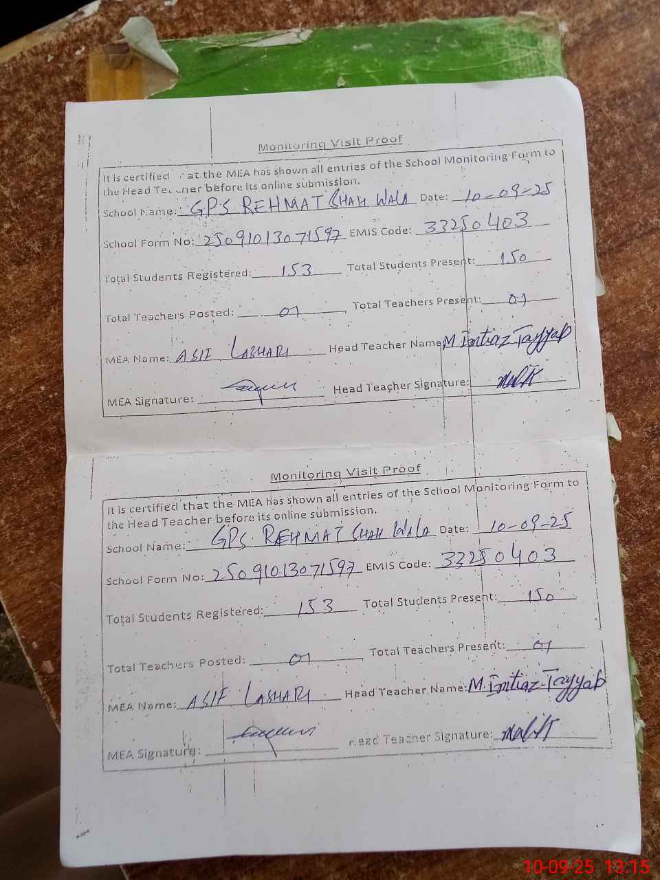 | Attendance Register | Head Teacher | MEA with School | Visit Proof |