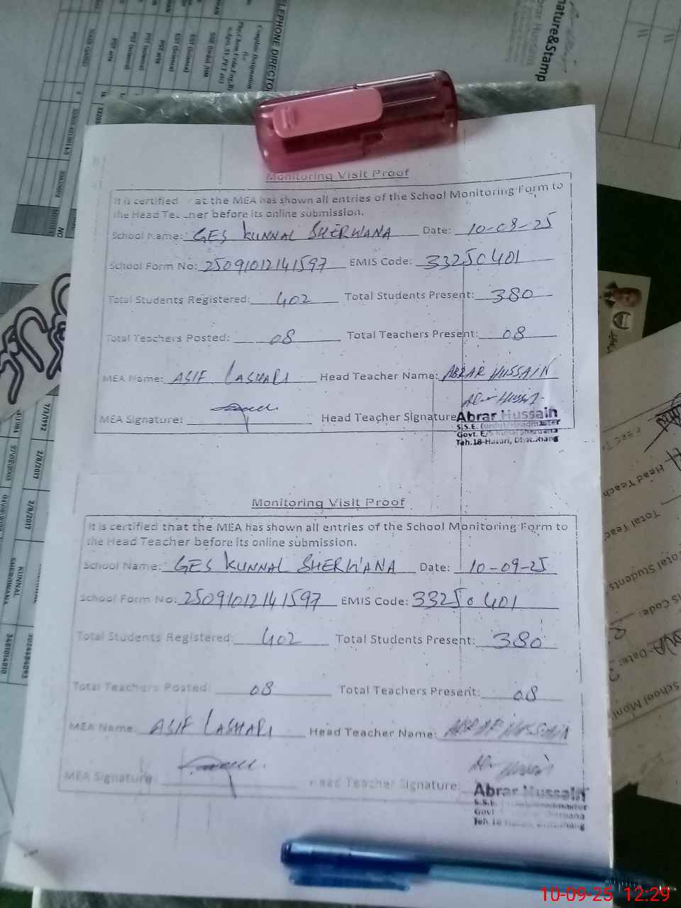 | Attendance Register | Head Teacher | MEA with School | Visit Proof |