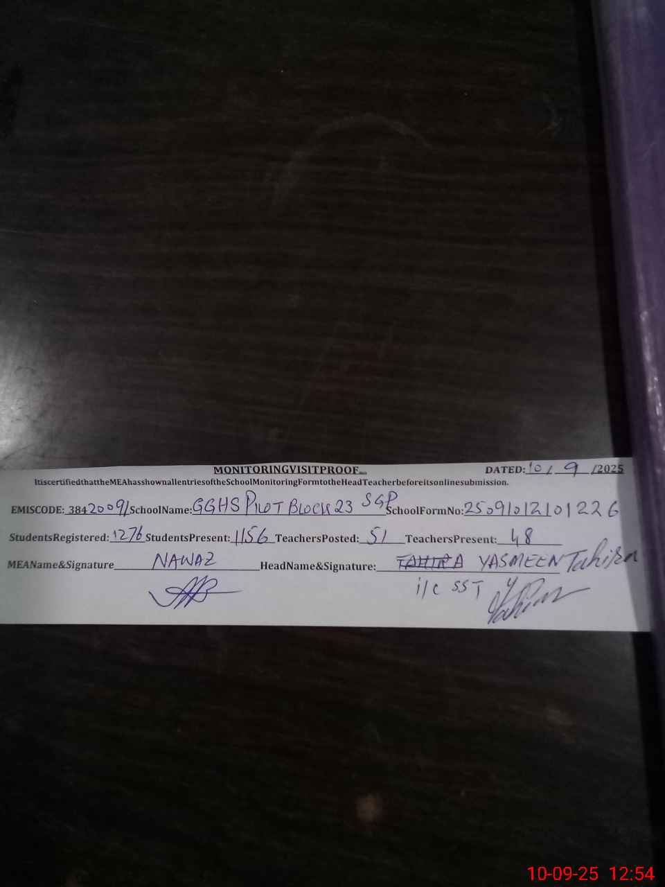| Monitoring Date: 10-09-2025 | Start Time: 10-09-2025 12:10 PM | End Time: 10-09-2025 12:55 PM | Name of MEA: MU**** NA**** | |