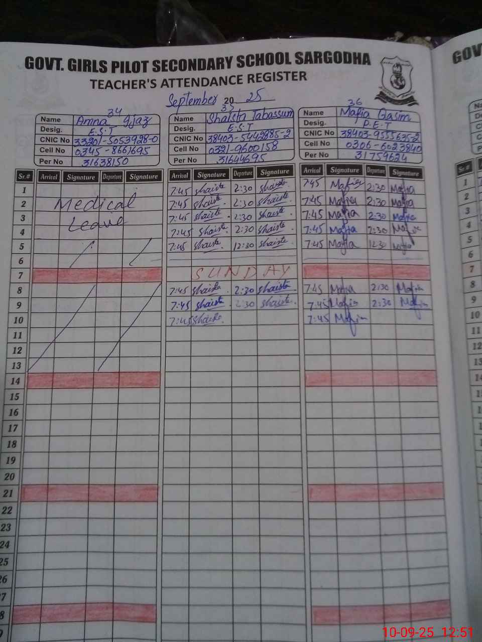 | CNIC | Full Name | Designation | R/C | Absence during last cal. month |