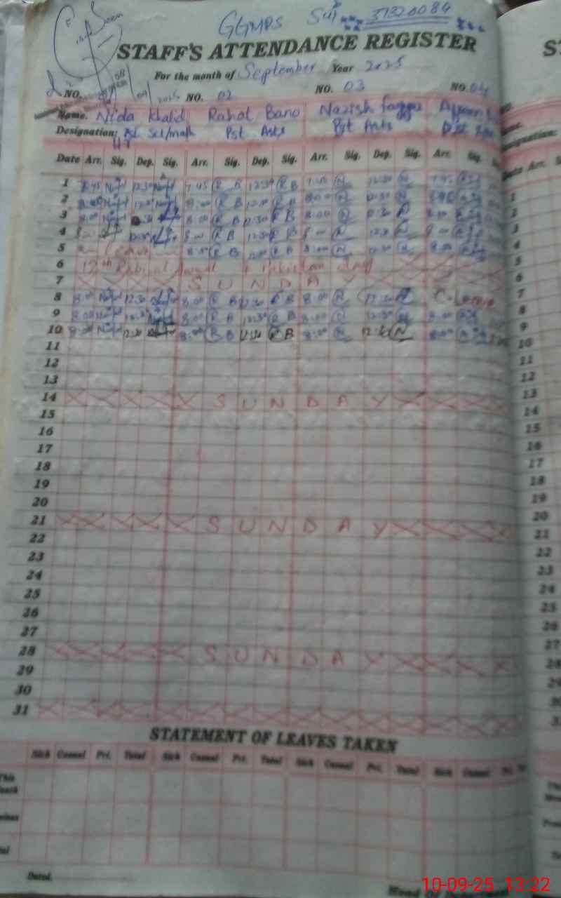 | CNIC | Full Name | Designation | R/C | Absence During Last Calender Month |
