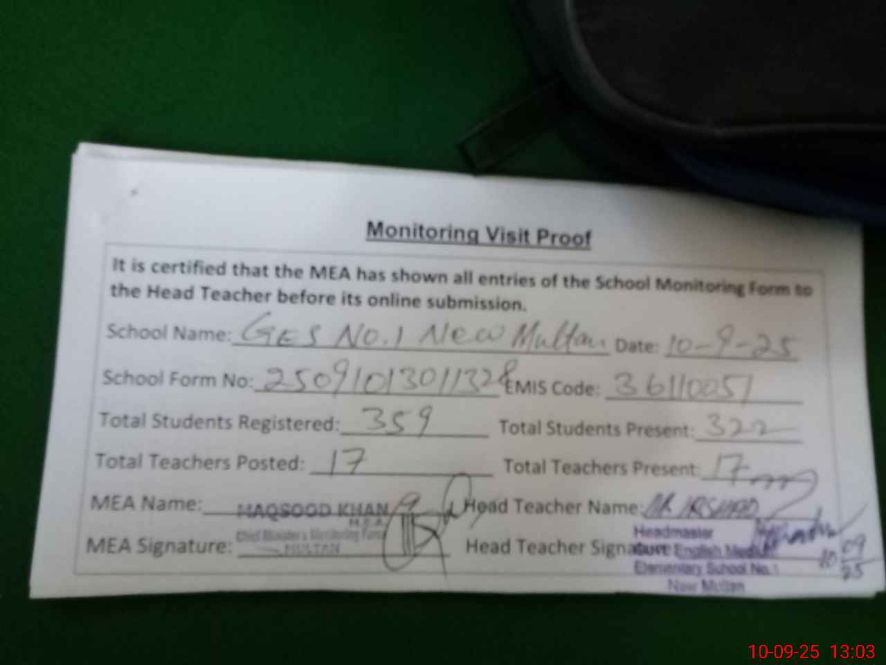 | Monitoring Date: 10-09-2025 | Start Time: 10-09-2025 12:50 PM | End Time: 10-09-2025 01:04 PM | Name of MEA: MA**** ULHA**** KH**** | |