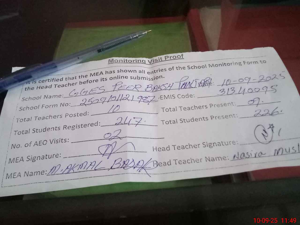 | Attendance Register | Head Teacher | MEA with School | Visit Proof |