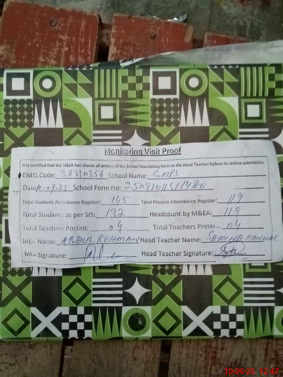 | Attendance Register | Head Teacher | MEA with School | Visit Proof |