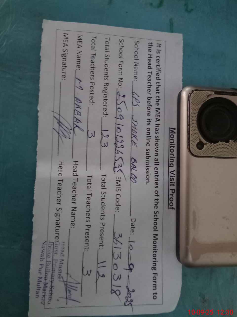 | Name: MO**** UM**** Designation: (School Headmaster's/Headmistress's) PST/PTC/JV Phone/Cell Number: 03**** |