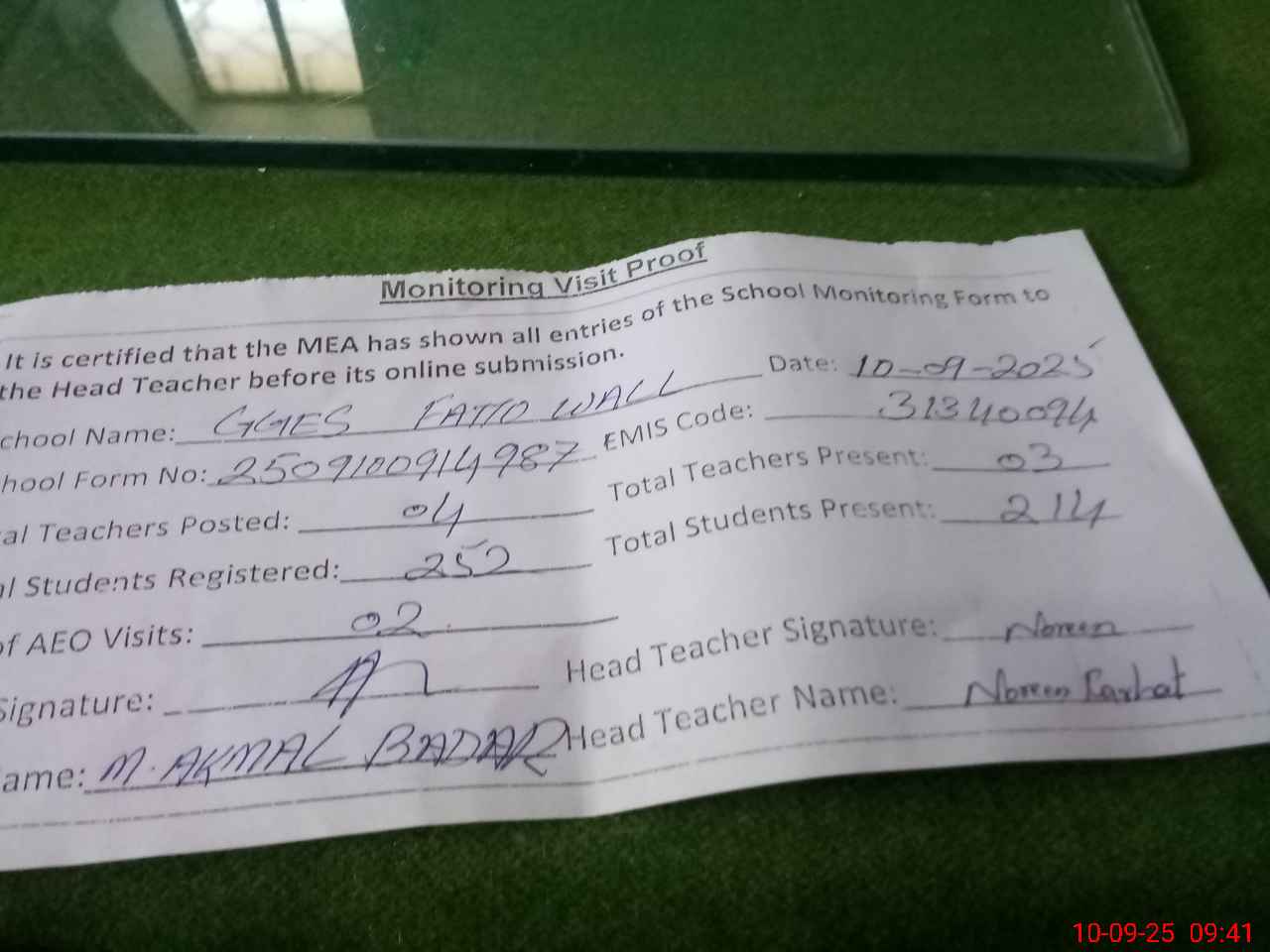 | Attendance Register | Head Teacher | MEA with School | Visit Proof |