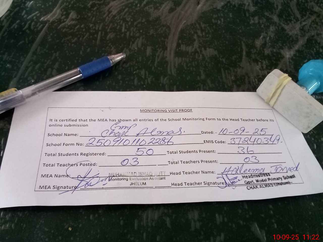 | Attendance Register | Head Teacher | MEA with School | Visit Proof |