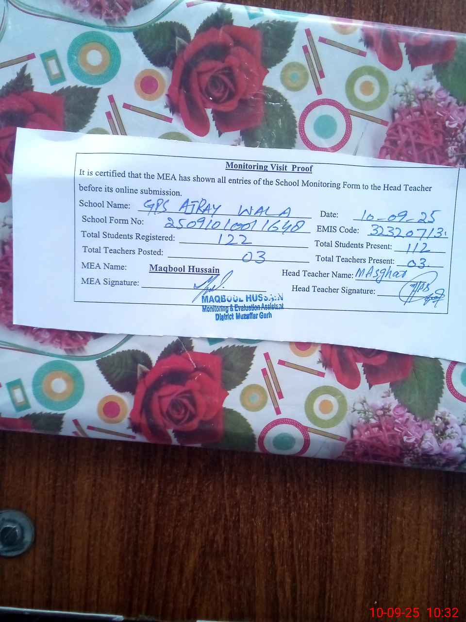 | Attendance Register | Head Teacher | MEA with School | Visit Proof |