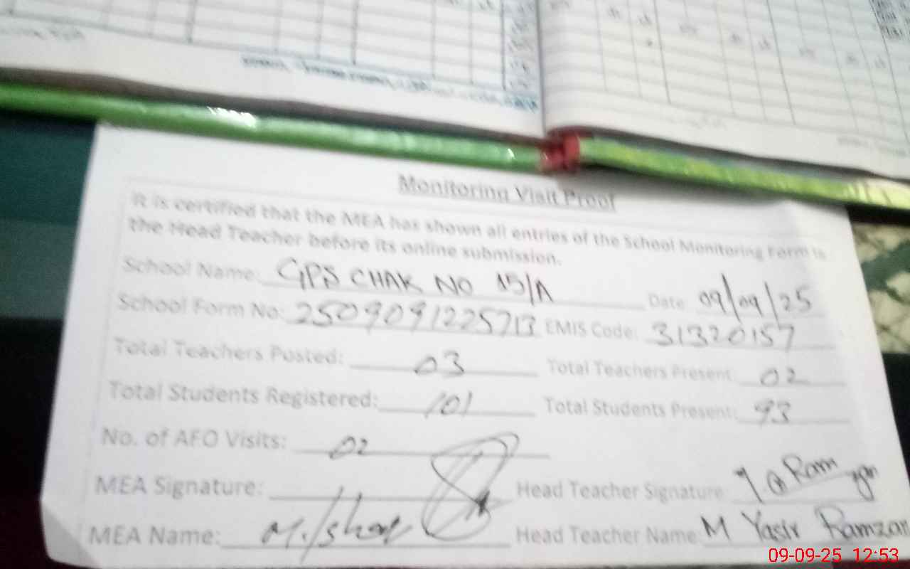 | EMIS Code: 31320157 | Name of School: GPS CHAK 15/A | |||