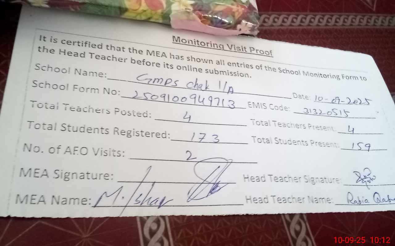 | EMIS Code: 31320515 | Name of School: GMPS CHAK NO.1/A | |||