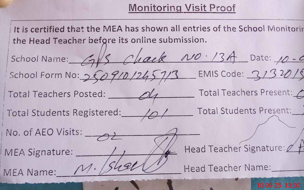 | EMIS Code: 31320156 | Name of School: GPS CHAK NO. 13/A | |||