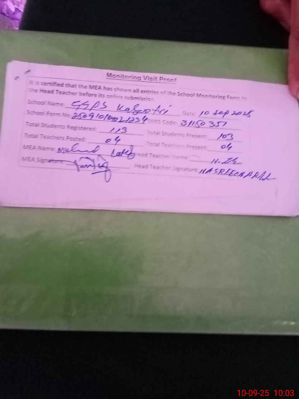 | Attendance Register | Head Teacher | MEA with School | Visit Proof |