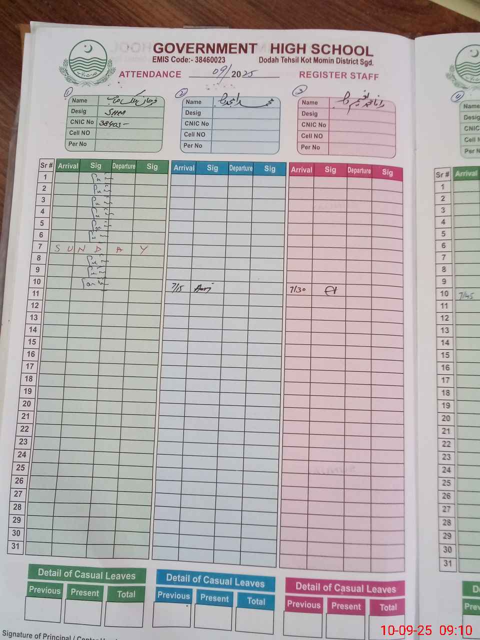 | CNIC | Full Name | Designation | R/C | Absence During Last Calender Month |