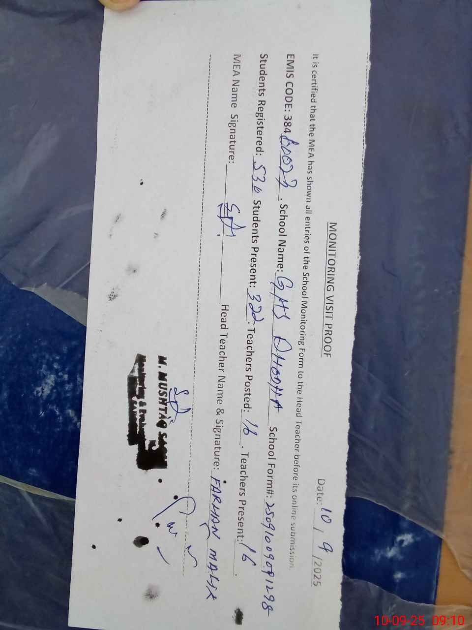 | Attendance Register | Head Teacher | MEA with School | Visit Proof |