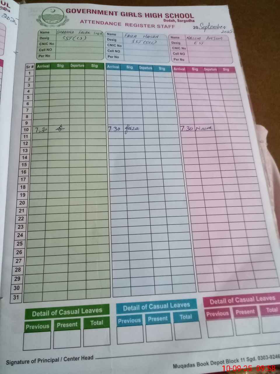 | CNIC | Full Name | Designation | R/C | Absence During Last Calender Month |