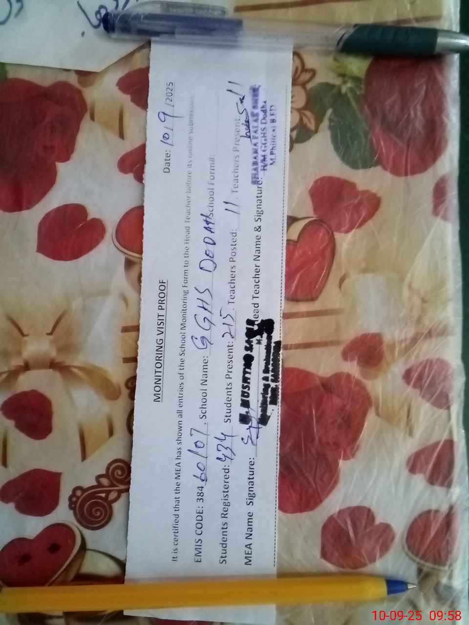 | Attendance Register | Head Teacher | MEA with School | Visit Proof |