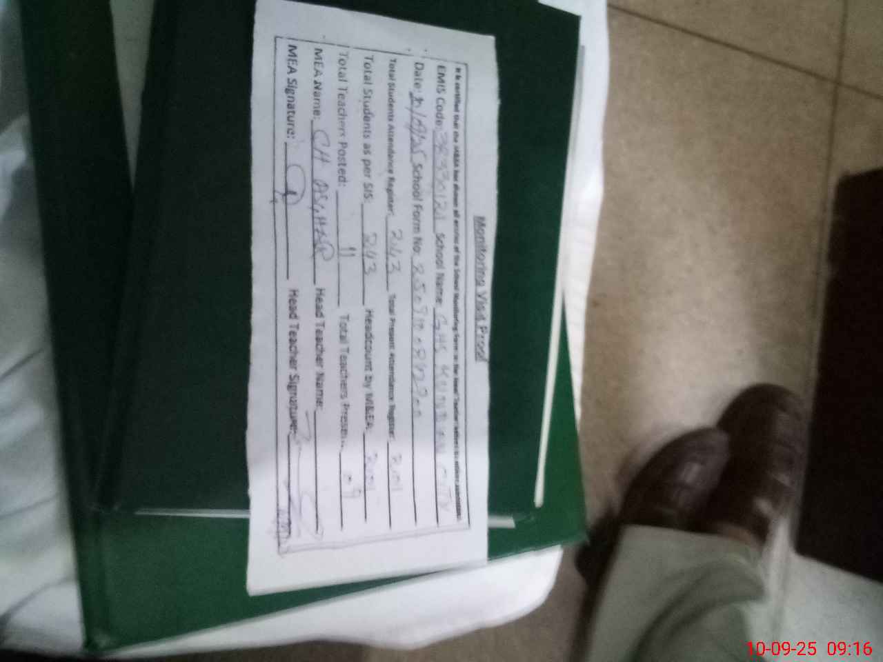 | Attendance Register | Head Teacher | MEA with School | Visit Proof |