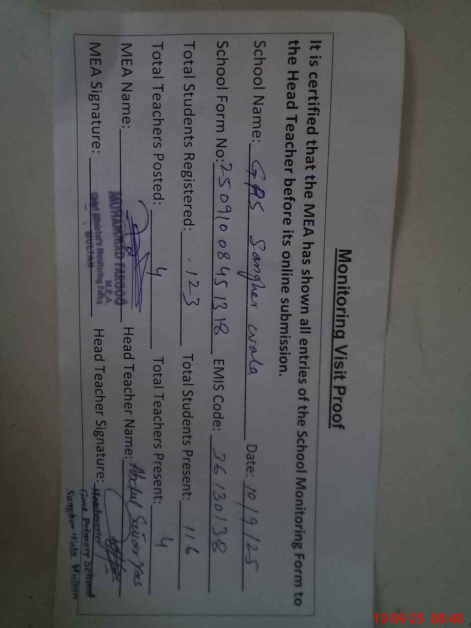 | EMIS Code: 36130138 | Name of School: GPS SANGHER WALA P/O SANGHER WALA | |||