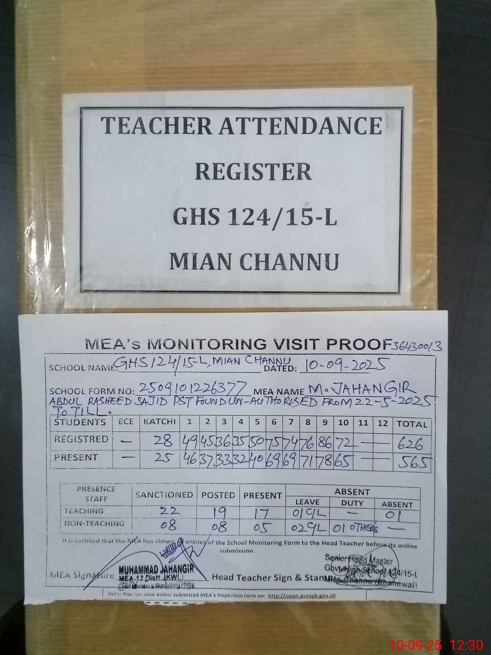 | Attendance Register | Head Teacher | MEA with School | Visit Proof |