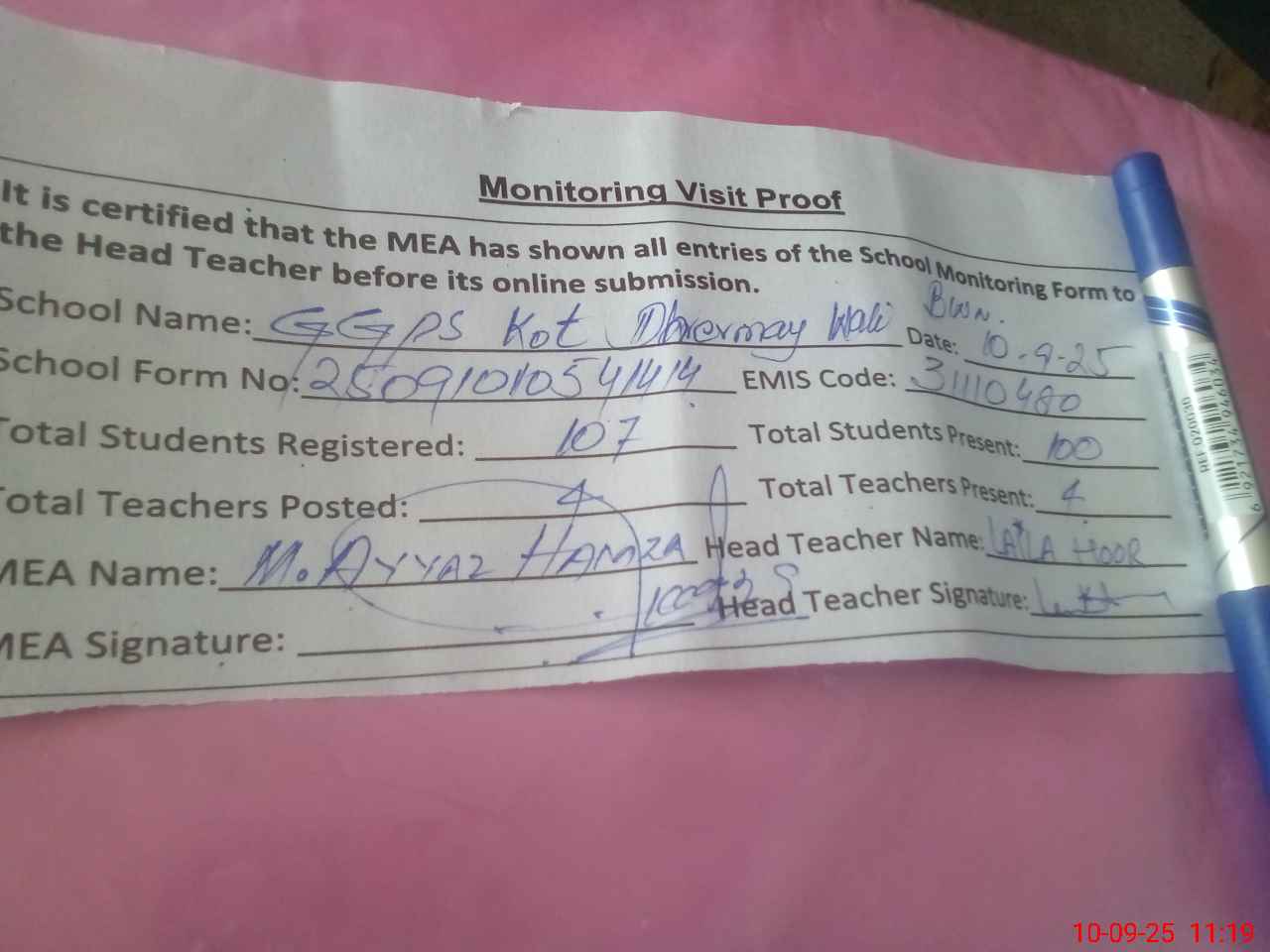 | EMIS Code: 31110480 | Name of School: GGPS KOT DHERMAY WALI | |||