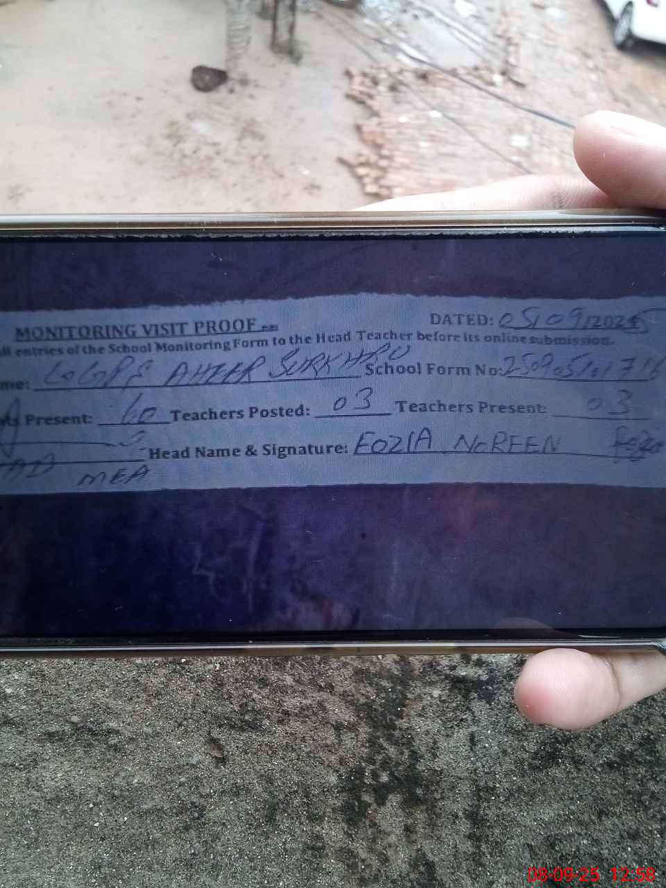 | Attendance Register | Head Teacher | MEA with School | Visit Proof |