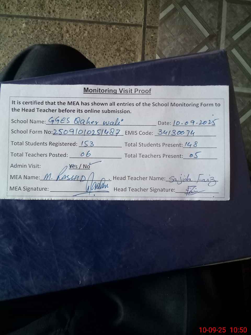 | Attendance Register | Head Teacher | MEA with School | Visit Proof |