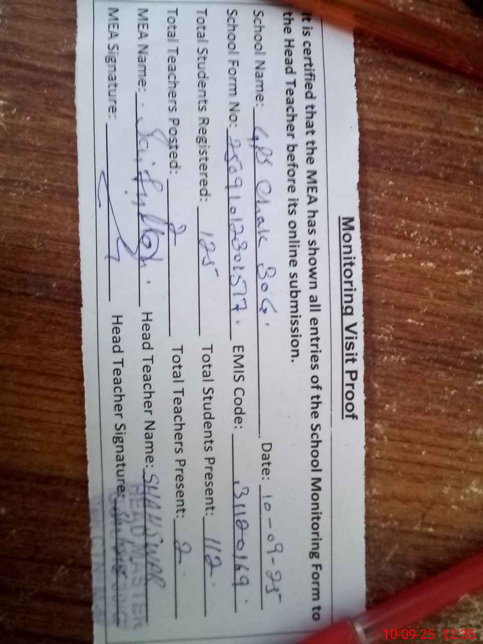 | Attendance Register | Head Teacher | MEA with School | Visit Proof |