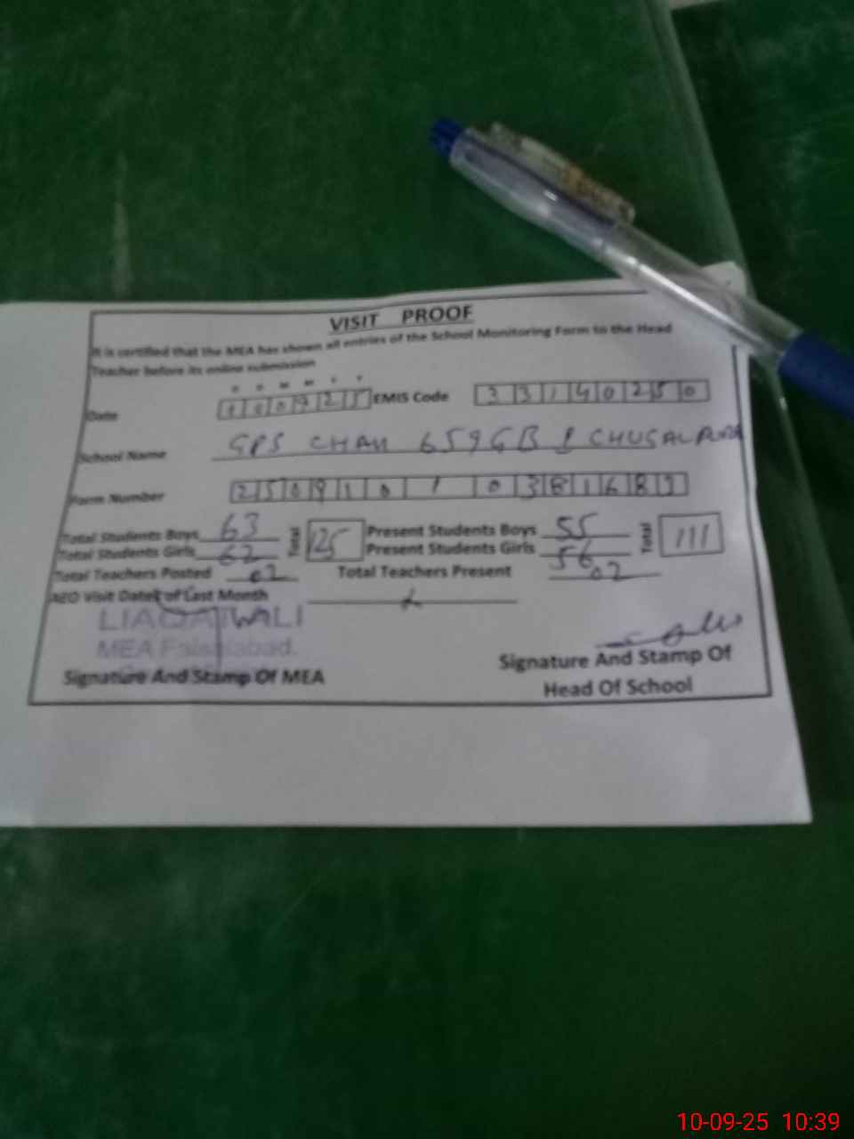 | Attendance Register | Head Teacher | MEA with School | Visit Proof |