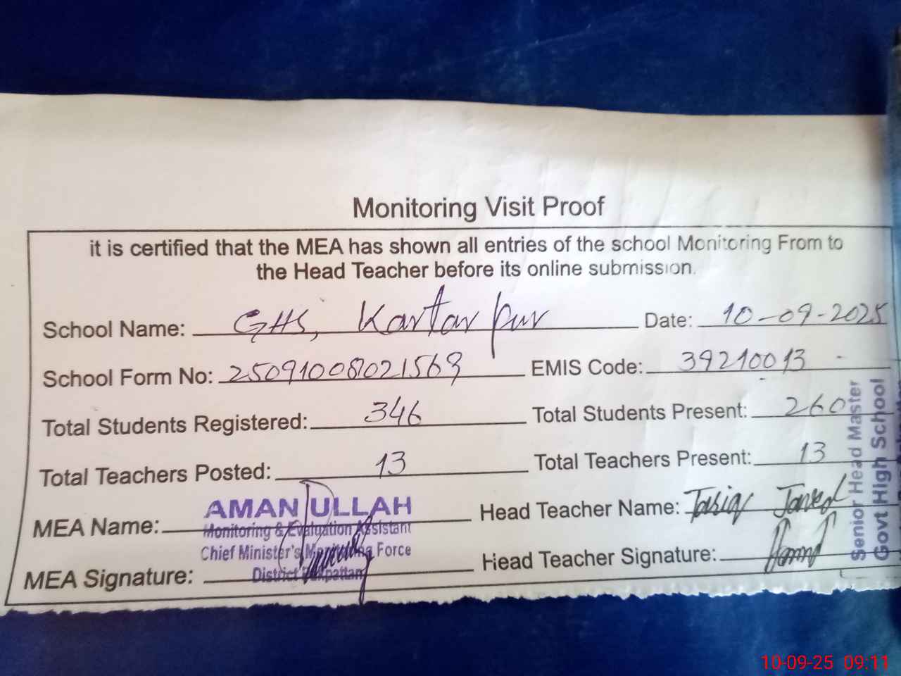 | Attendance Register | Head Teacher | MEA with School | Visit Proof |