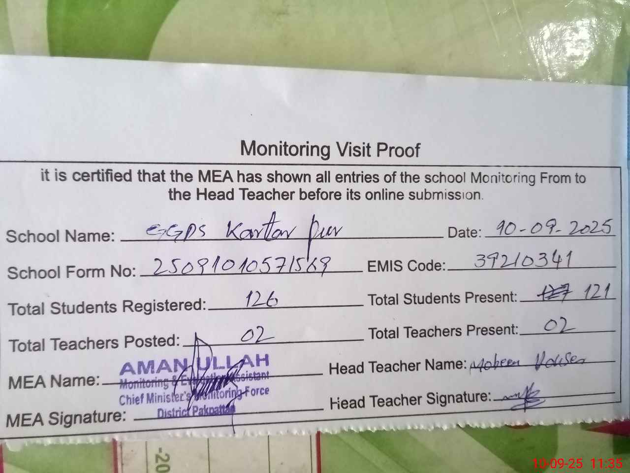 | EMIS Code: 39210341 | Name of School: GGPS KARTAR PUR PAKPATTAN | |||