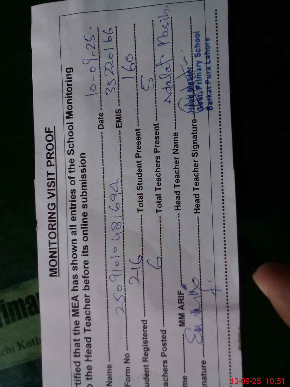 | EMIS Code: 35220166 | Name of School: GPS BARKAT PURA RAIWIND ROAD TEH MODEL TOWN | |||