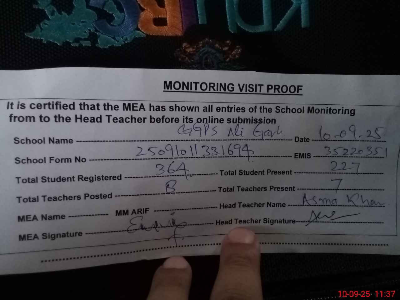 | Attendance Register | Head Teacher | MEA with School | Visit Proof |