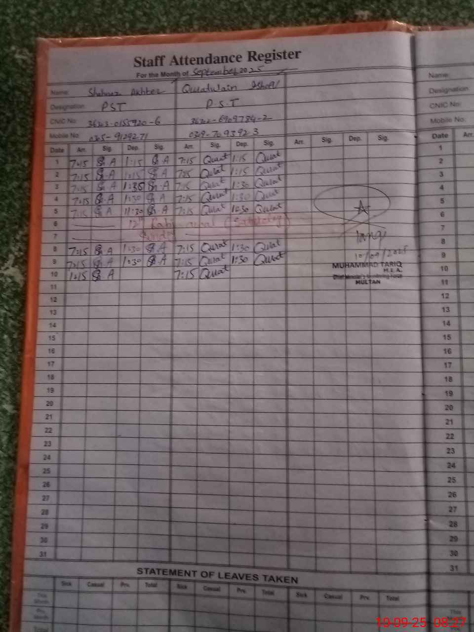 | Name: SH**** AK**** Designation: (School Headmaster's/Headmistress's) PST Phone/Cell Number: 03**** |