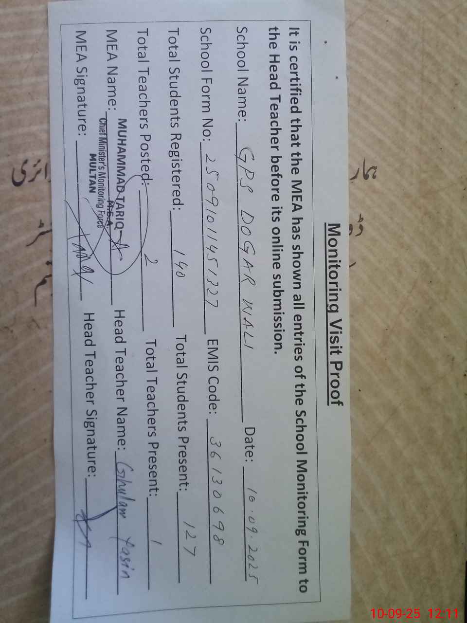 | Attendance Register | Head Teacher | MEA with School | Visit Proof |