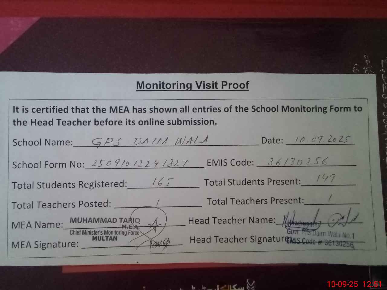 | Attendance Register | Head Teacher | MEA with School | Visit Proof |