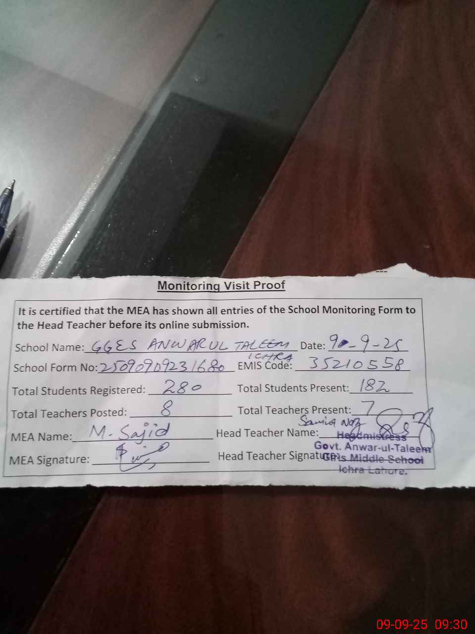| Attendance Register | Head Teacher | MEA with School | Visit Proof |