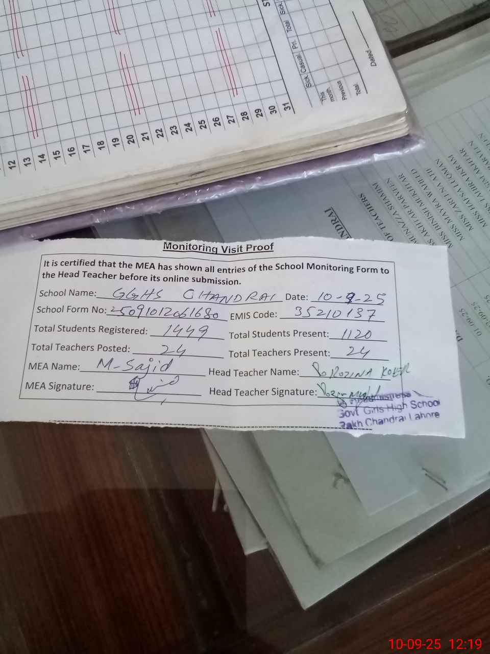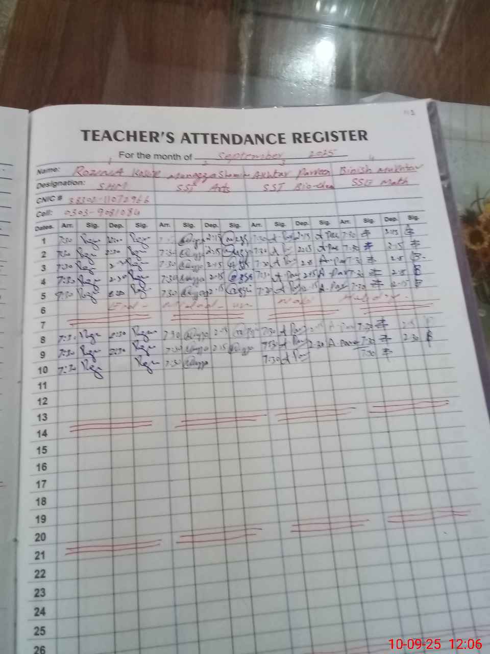 | Remarks (Use Separate Page if Required): NSB bank statement for August 2025 is not available PST Fareeha Irshad has gone to DDEO Office for promotion From PST to EST Three classrooms and one hall apparently seems dangerous and the case has been raised for declaration of dangerous Six hundred students are without furniture according to head and a letter is written to higher authorities by her Present students percentage is 77 percent Four toilets found blocked Only one soap found at students hand wash points 35210137 | |||||