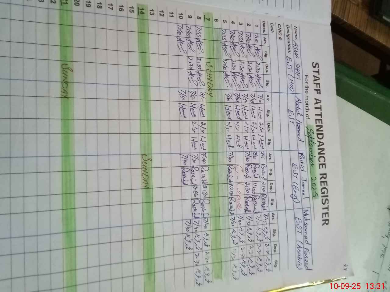 | CNIC | Full Name | Designation | R/C | Absence During Last Calender Month |
