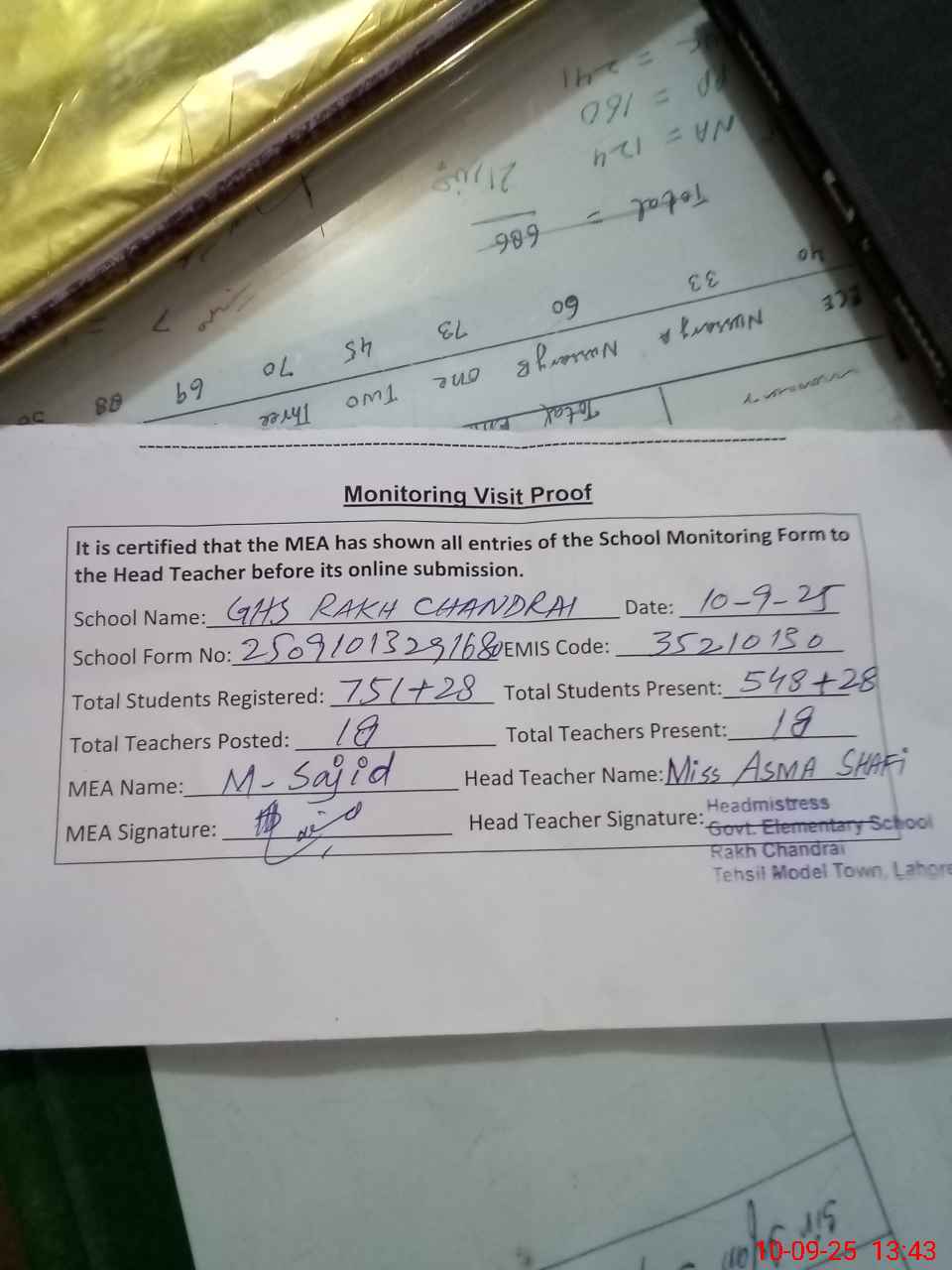 | Remarks (Use Separate Page if Required): Water found gathered in ground Two toilets doors are broken from bottom Water filter is unserviceable since long Two classrooms apparently seems dangerous School head SST Muhammad Irfan is placed under suspension since 22 Sep 2024 Present students percentage is 74 percent 28 students are registered in ninth class 35210130 | |||||
