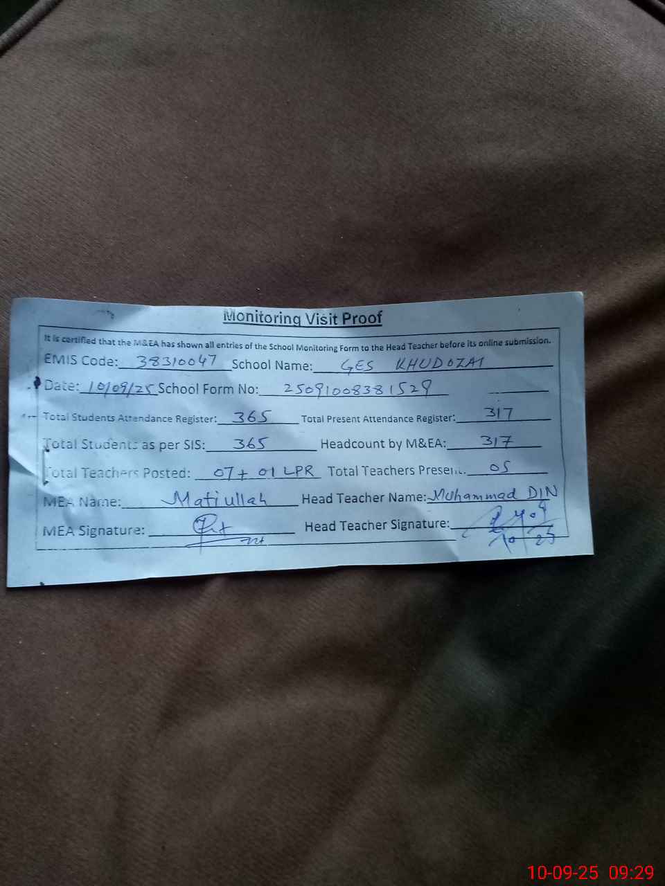 | Attendance Register | Head Teacher | MEA with School | Visit Proof |