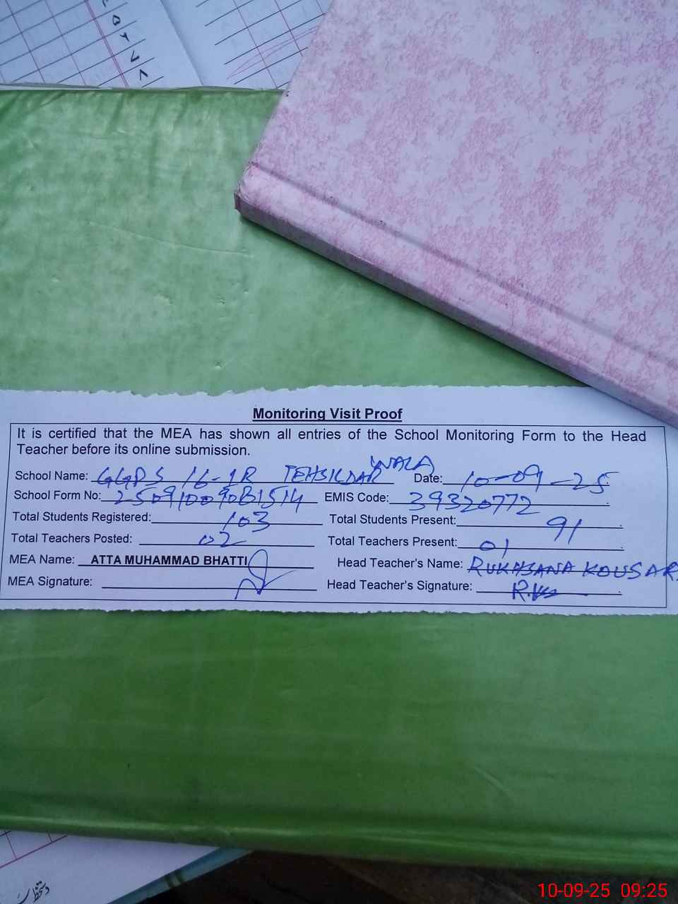 | Attendance Register | Head Teacher | MEA with School | Visit Proof |